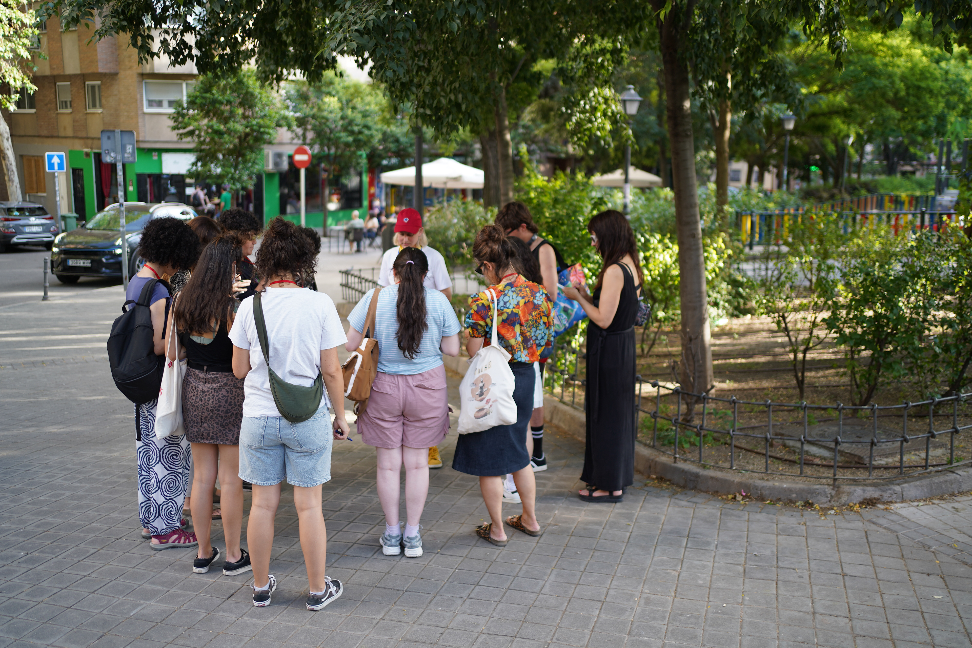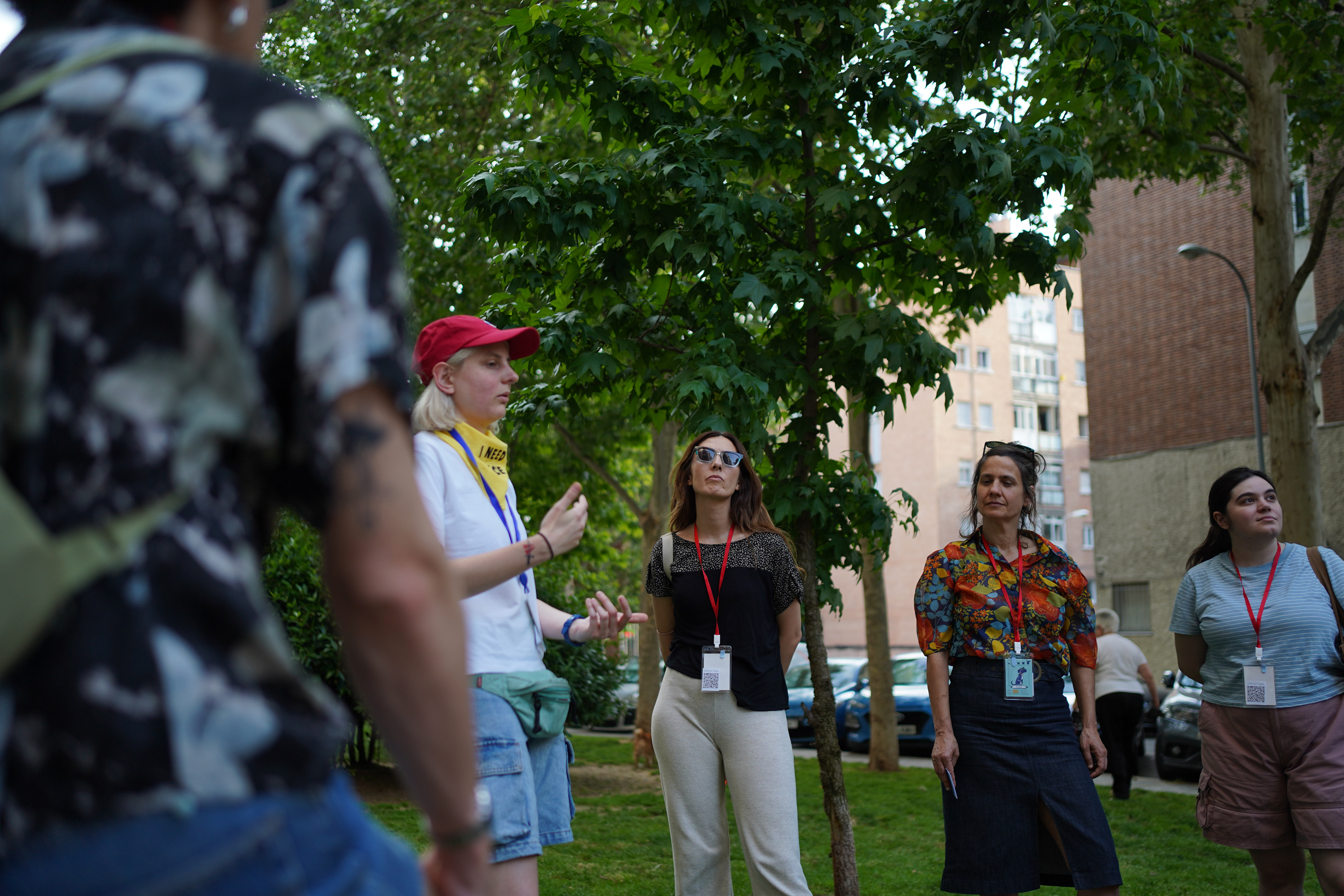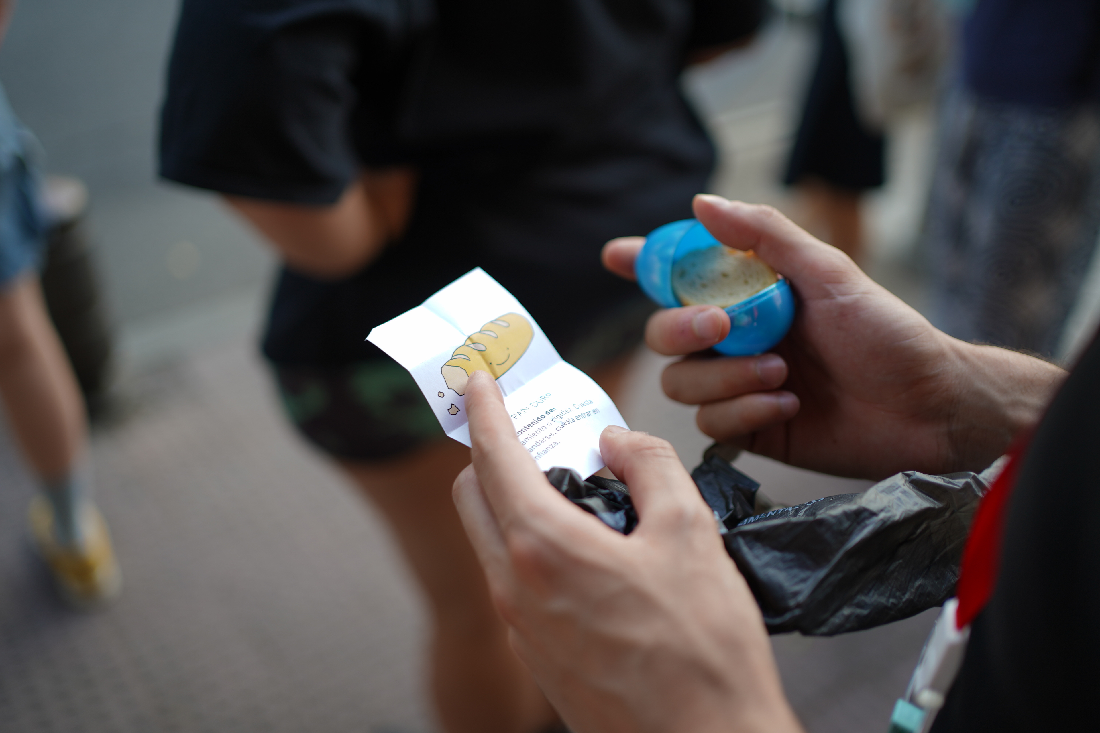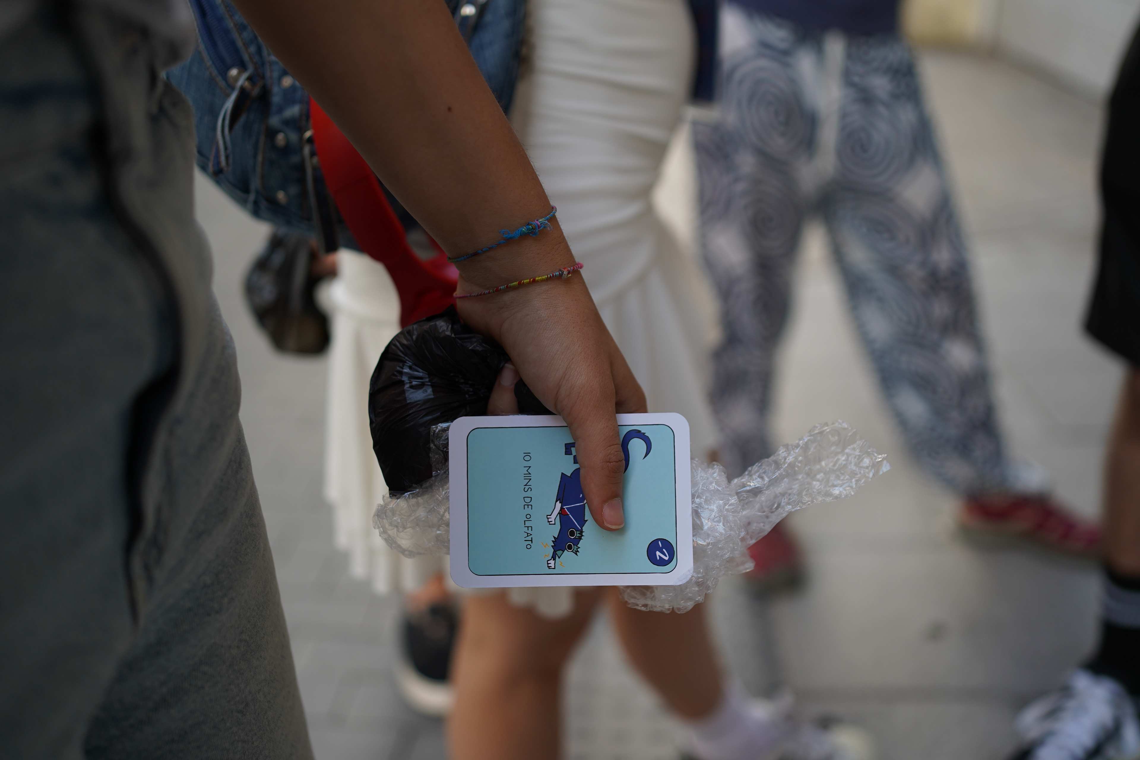 Durante el paseo, las participantes usaban una carta de Tomasa colgando del cuello a modo Tamagotchi para ir marcando la ansiedad y reconocer momentos de tensión. Un real life bingo servía para activar la alerta y la observación, identificando en la ciudad los estímulos que disparan reacciones inesperadas. Las cartas coreografiadas les permitían experimentar los movimientos que Tomasa y yo usamos para esquivar obstáculos cotidianos. Pequeños objetos de calma ayudaban a bajar la ansiedad, y en la última etapa cada persona caminaba acompañada de Tomasa a modo de guía de navegación autónoma, mientras yo desaparecía.