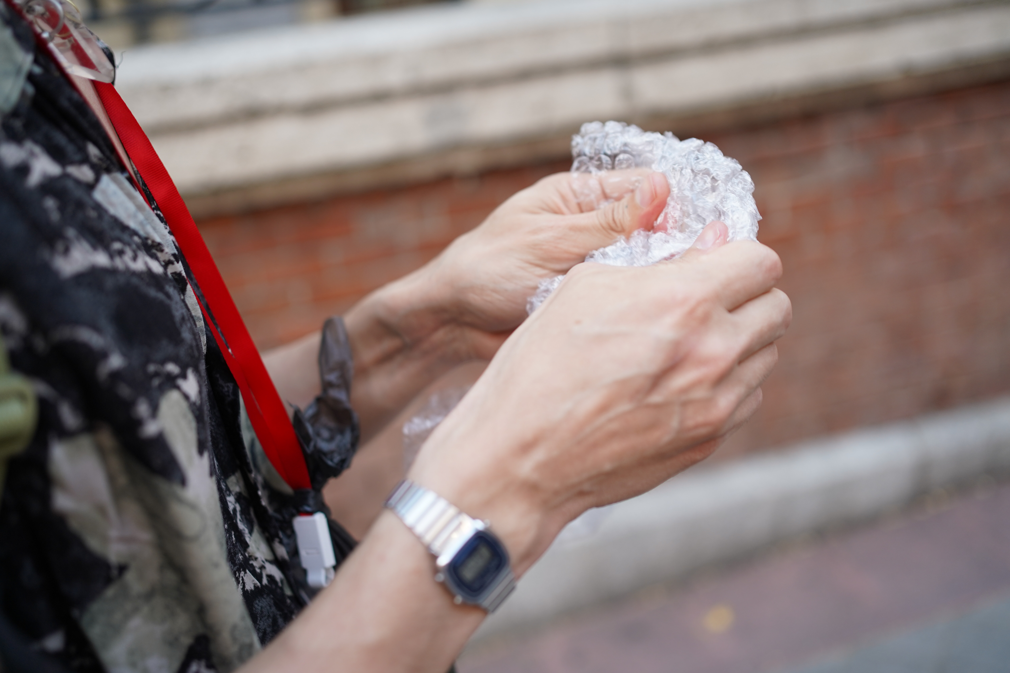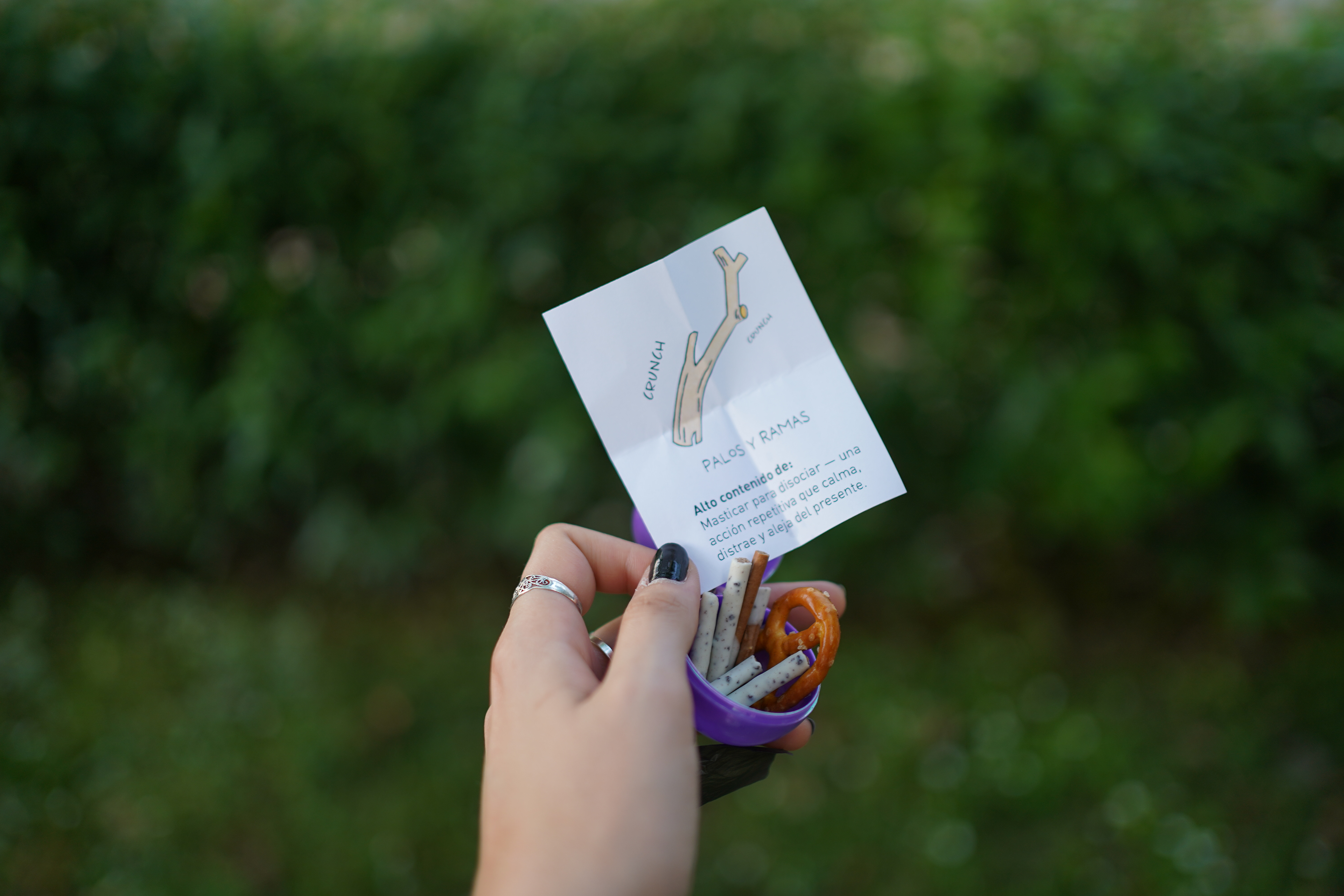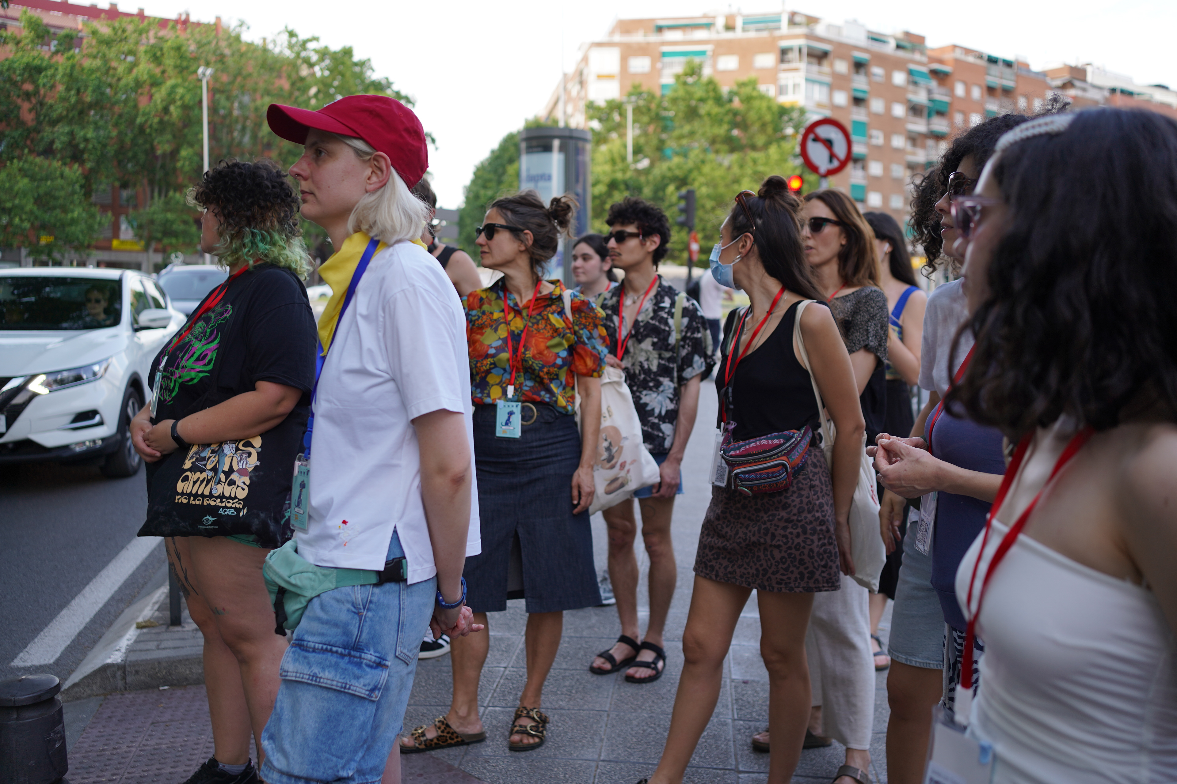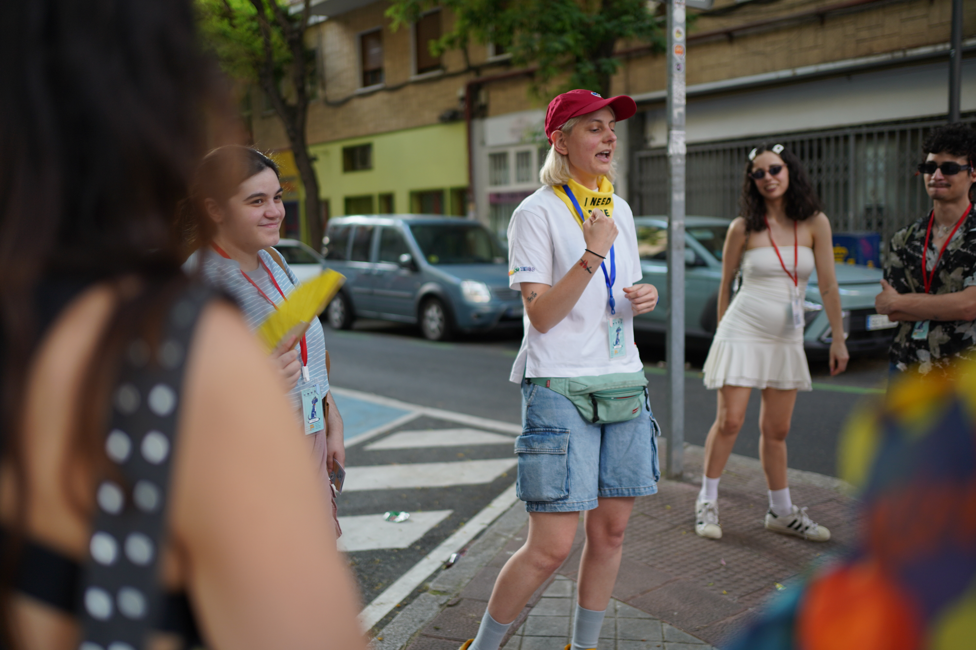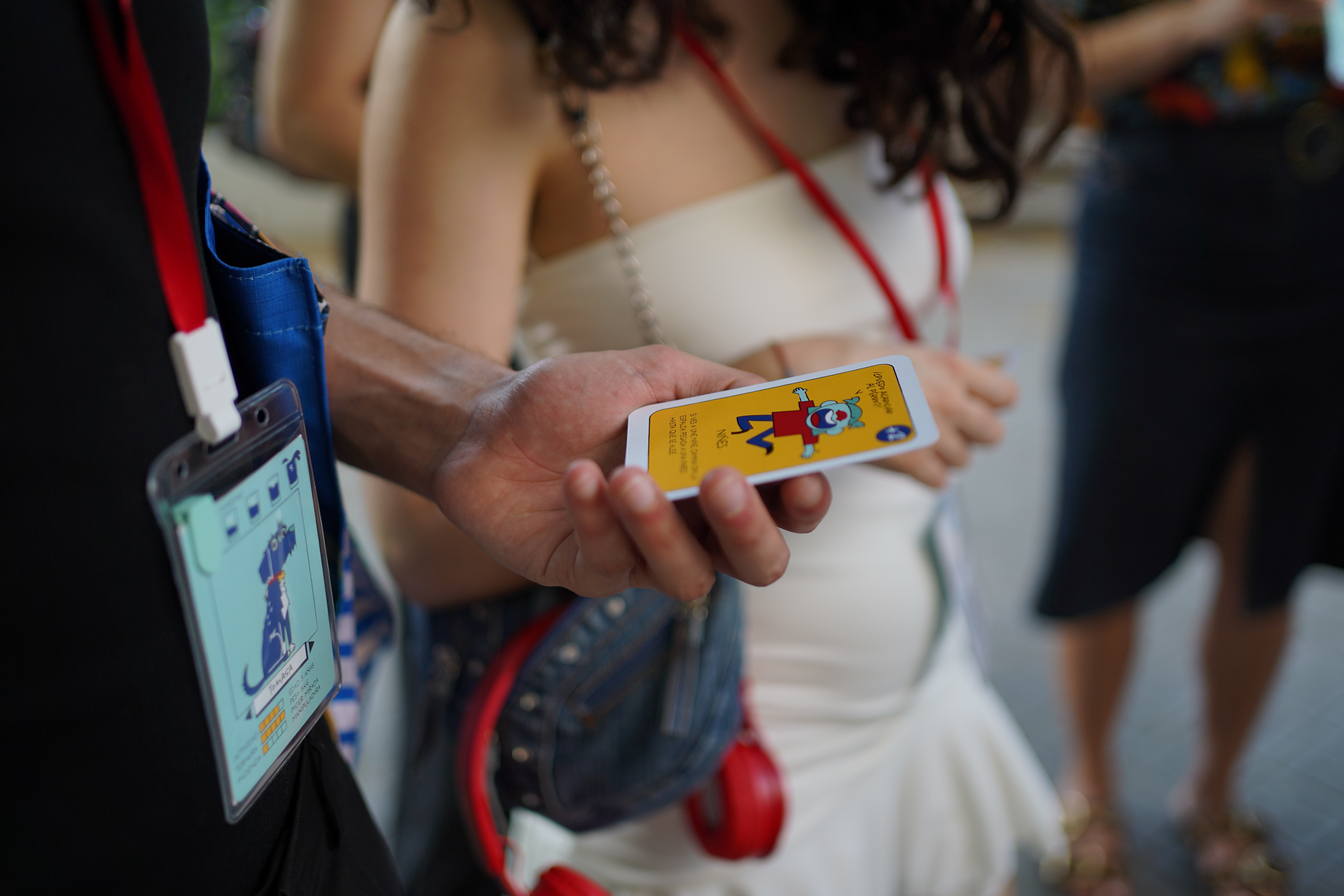 Durante el paseo, las participantes usaban una carta de Tomasa colgando del cuello a modo Tamagotchi para ir marcando la ansiedad y reconocer momentos de tensión. Un real life bingo servía para activar la alerta y la observación, identificando en la ciudad los estímulos que disparan reacciones inesperadas. Las cartas coreografiadas les permitían experimentar los movimientos que Tomasa y yo usamos para esquivar obstáculos cotidianos. Pequeños objetos de calma ayudaban a bajar la ansiedad, y en la última etapa cada persona caminaba acompañada de Tomasa a modo de guía de navegación autónoma, mientras yo desaparecía.